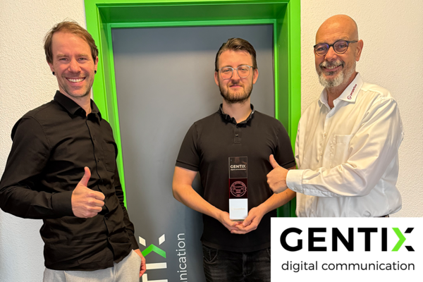 Es war uns eine grosse Freude, Steven Matter (links) und Mauricio Besserer (Mitte) von Gentix AG den Award zu überreichen. Antonio Rubichi (rechts) und das gesamte peoplefone Team gratulieren herzlichst zu dieser Auszeichnung. Wir blicken gespannt auf viele weitere erfolgreiche gemeinsame Projekte im Jahr 2026!