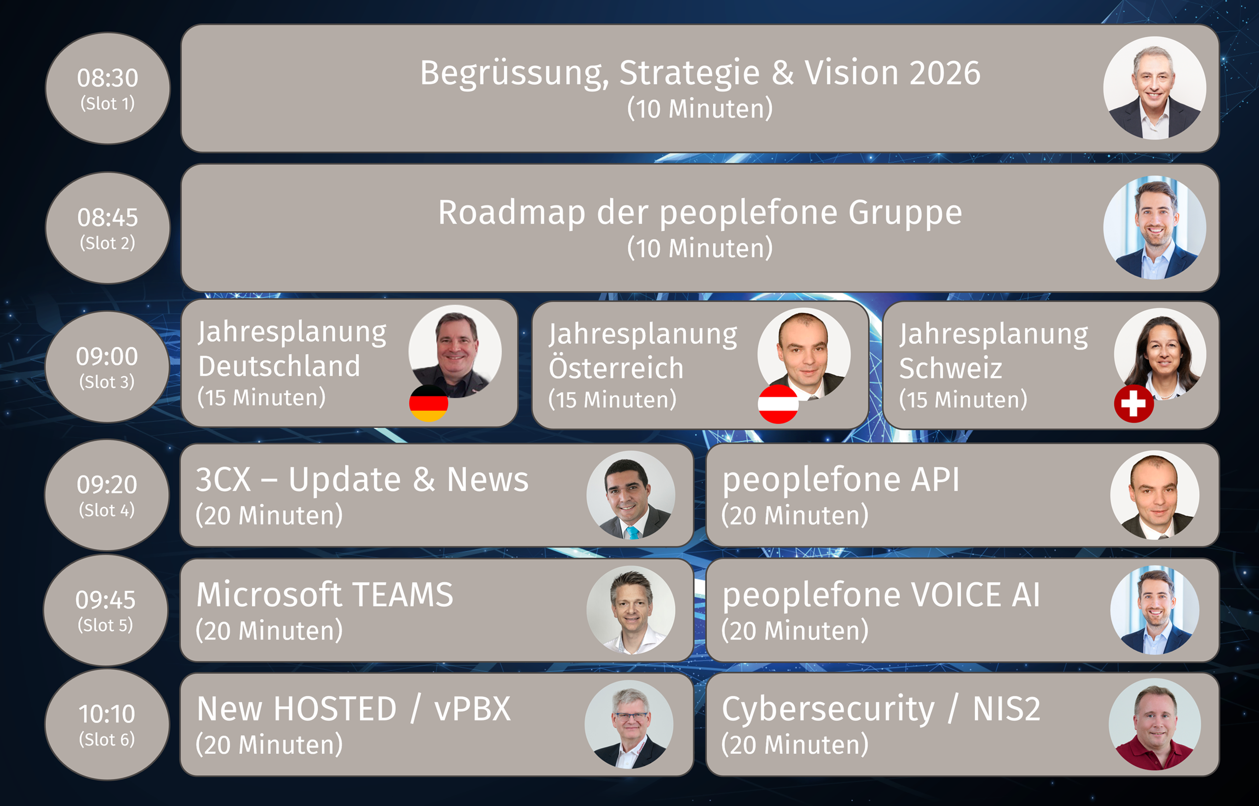 | 08h30 | Begrüssung, Strategy & Vision 2026 (präsentiert durch Christophe Beaud, CEO peoplefone Gruppe) |