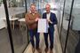 peoplefone Geschäftsführer und Urkunden-Kurier Felix Pflüger überreichte heute, in den Geschäftsräumen der IS Intelligent Solution GmbH, die Auszeichnung zum GOLD-Partner an Christopher Nehls, für die hervorragende Beratungs- und Betreuungsleistung zu peoplefone Lösungen und Dienstleistungen.