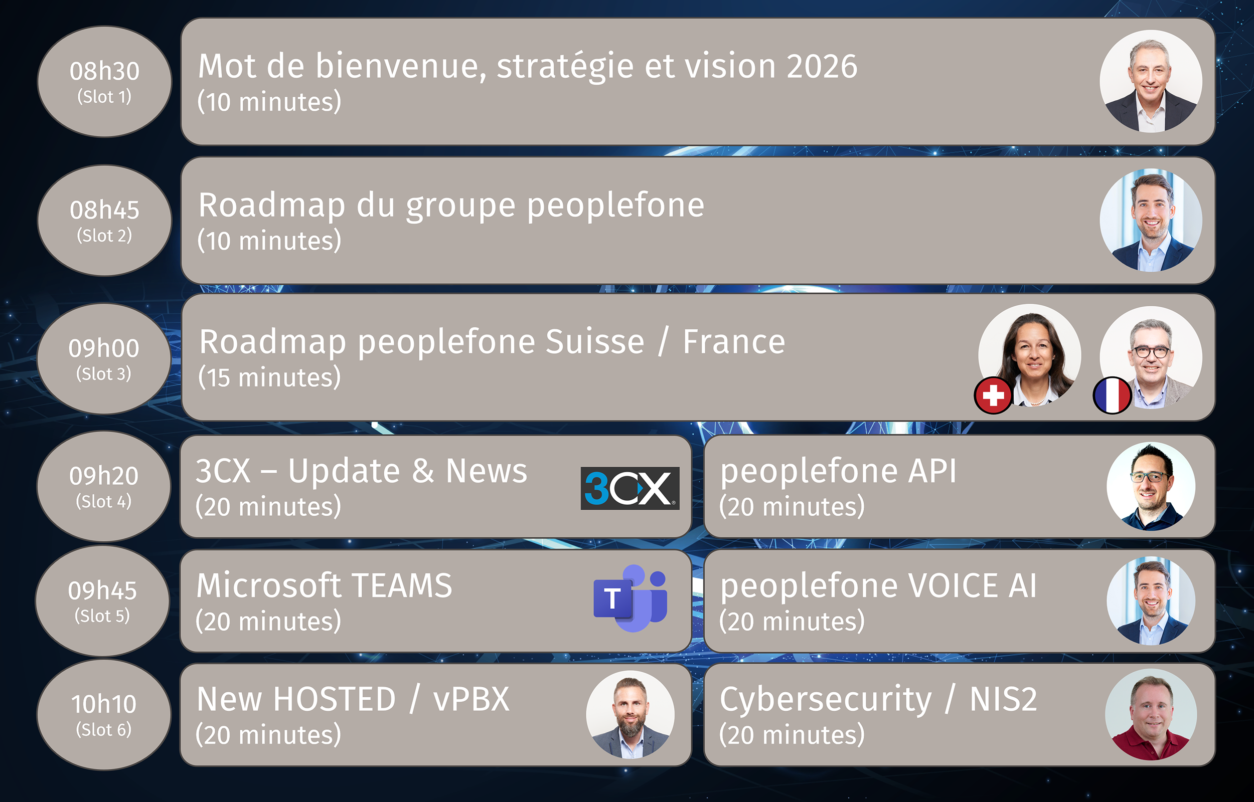 | 08h30 | Mot de bienvenue, stratégie et vision 2026 (présenté par Christophe Beaud, CEO peoplefone Groupe) |